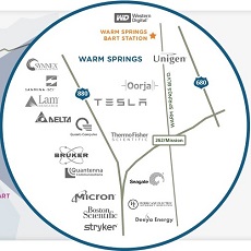 Warm Springs district, located 7 miles southeast of Downtown and bounded by 2 major highways, currently houses many industrial tech companies. The city is kick-starting an 850-acre "Innovation District" development, surrounding the new Warm Springs BART Station. Planning to add offices, hotels, entertainment, public facilities, housing units, retail spaces and schools.
